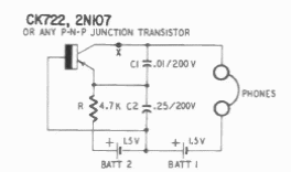 Este circuito aparece em outros pontos deste site usando os mais diversos transistores. Esta versão é de uma documentação de 1960 fazendo uso do 2N107 ou CK722 transistores de germânio da época.