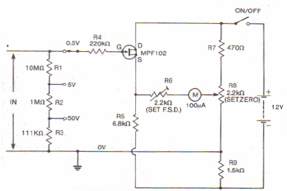 Este simples circuito pode ser usado com um microamperímetro comum ou com a escala mais baixa de corrente de um multímetro. A resistência de entrada é de 11,1 M ohms.