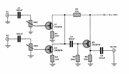 Esta configuração com transistores JFET é bem conhecida, podendo ser encontrada com variações em outros pontos deste site. Os FETs admitem equivalentes de uso geral.