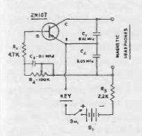 Este oscilador para prática de telegrafia com um transistor usa fones magnéticos de alta impedância. O circuito é de uma documentação americana de 1956.