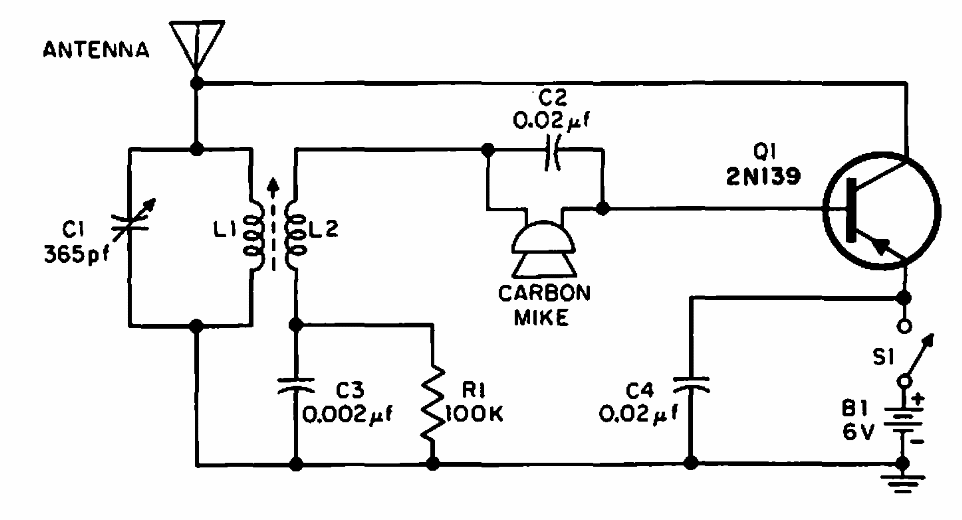 Encontrado em documentação da Radio Shack de 1965, este circuito para AM de curto alcance pode ser elaborado com transistores como o BC558. A bonina L1 é formada por 80 espiras de fio 28 em bastão de ferrite com 15 espiras para L2 no mesmo núcleo.