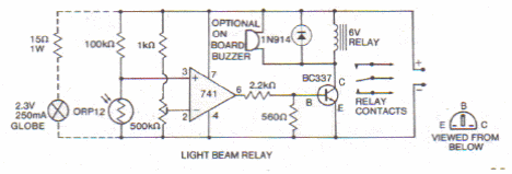 O corte da luz que incide no LDR faz com que o relé seja disparado. A fonte de luz pode ser outra, diferente da indicada. O circuito é alimentado por 6 V ou conforme o relé e o buzzer.