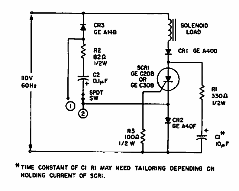 Este circuito se destina ao disparo de SCRs no semiciclo positivo para controle de solenoides. O circuito é do Manual de SCRs da General Electric de 1967.