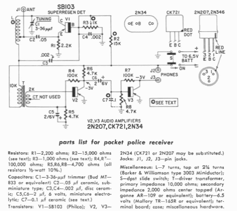 Este receptor para a faixa de polícia que na época era de 45 MHz foi encontrado numa publicação de Gernabck de 1960. Os transistores são tipos de germânio da época.