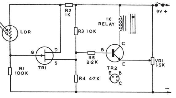 Usando como base um JFET, este sensível relé de luz foi encontrado numa documentação inglesa antiga. A tensão de alimentação entre 6 e 12 V deve ser de acordo com o relé utilizado.