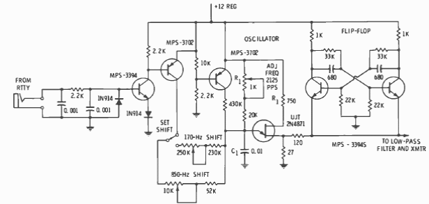 Este circuito usando apenas transistores foi encontrado em documentação de 1977. A frequência é de 4 250 pulsos por segundo. Os componentes podem ser alterados para outras frequências.