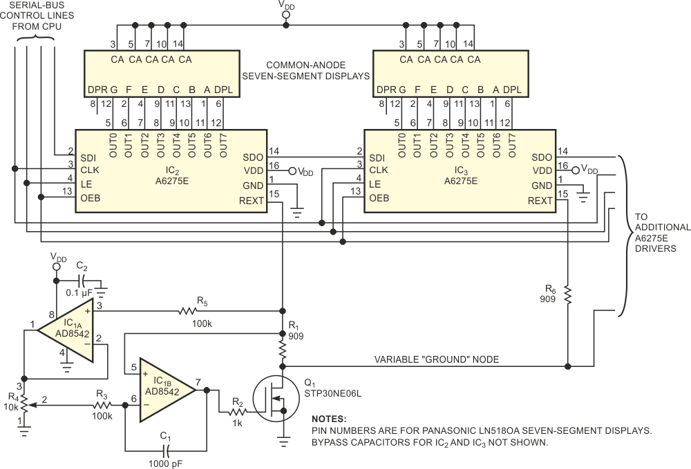 Com base no A6275 da Allegro, este circuito controla o brilho de diversos displays. O circuito é válido para displays de 7 segmentos de anodo comum.