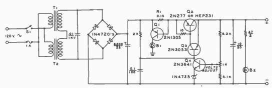 Essa fonte de 12 V fornece uma corrente máxima de 2 A sendo indicada para alimentação de equipamentos móveis. O circuito é de uma publicação americana de 1977.