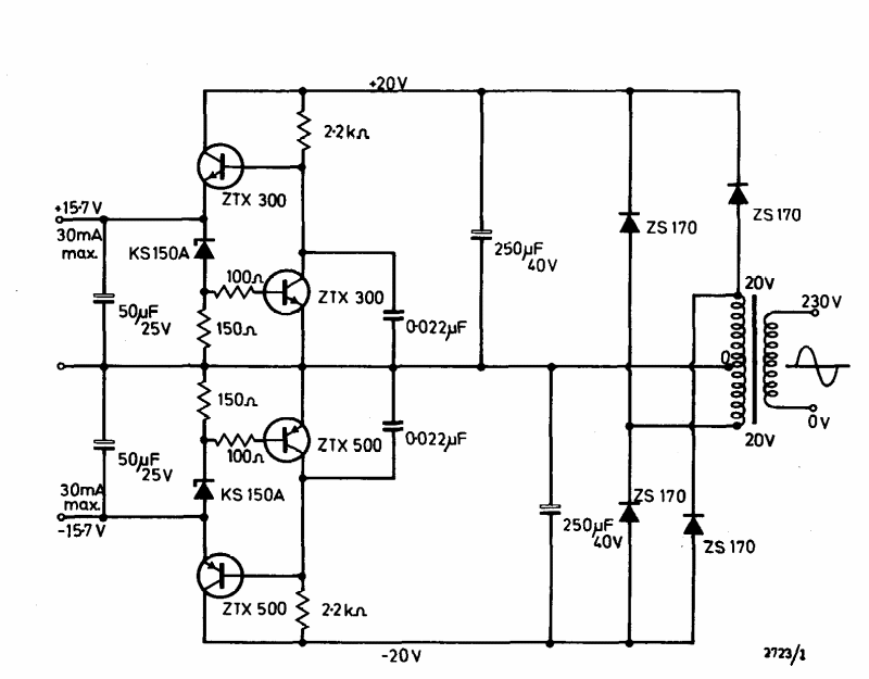 Esta fonte simétrica de 30 mA x 15 V foi encontrada no manual Ferranti de transistores de 1974. Os transistores são tipos comuns na época.