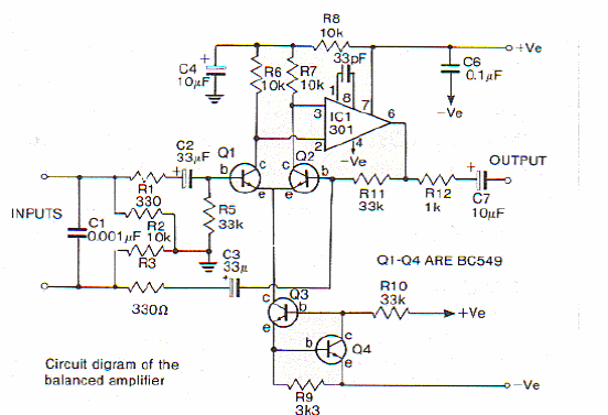 O circuito mostrado tem uma entrada diferencial e emprega transistores de um array de tipos casados. O circuito exige fonte simétrica tendo sido encontrado em manual de componentes estrangeiro.