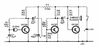 Este circuito de 3 transistores foi encontrado num manual da Mullard de 1960. Os transistores são de germânio da época e a escuta é em fone de alta impedância.