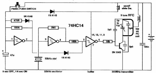 Encontrado numa publicação australiana de 1991, este circuito tem um alcance de 15 metros, quando alimentado com 5 V. A bobina pode ser elaborada na própria placa de circuito impresso.