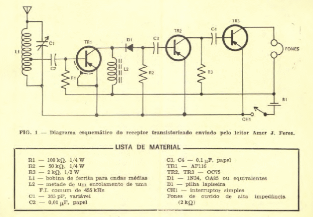 Este simples receptor para a faixa de ondas médias foi encontrado na revista Eletrônica Popular de abril de 1968. Trata-se de um projeto de leitor usando transistores de germânio da época.