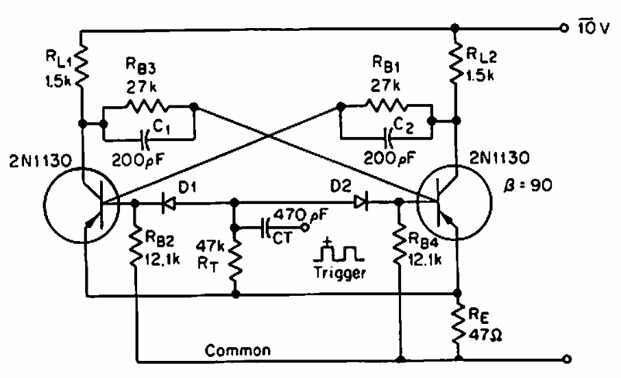 Encontrado em documentação americana, este circuito pode fazer uso de transistores equivalentes modernos. O circuito dispara com pulsos positivos.