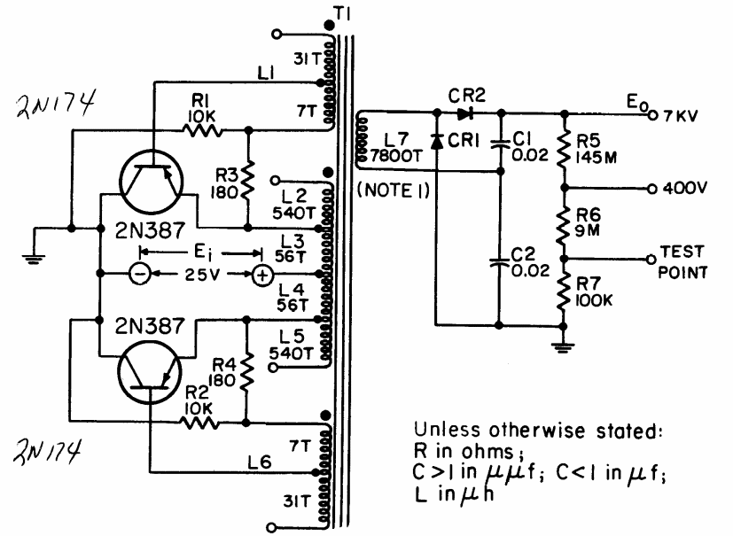 Este inversor transistorizado para alimentação de tubos de raios catódicos foi encontrado num manual da marinha dos Estados Unidos. Transistores equivalentes podem ser usados.