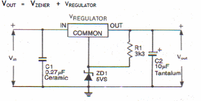 Na figura temos o modo de se aumentar a tensão deum 78xx acrescentando um diodo zener. A tensão de saída será a tensão do regulador mais a tensão do diodo zener.