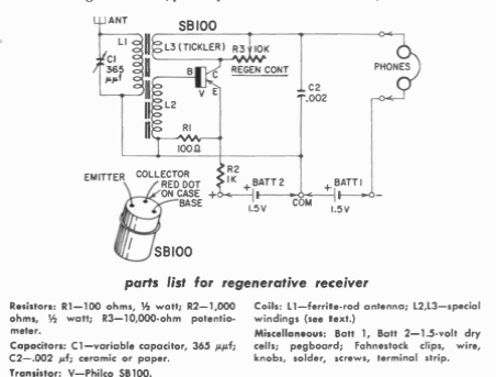 Indicado para a faixa de ondas médias, este receptor foi encontrado numa publicação de Gernsback de 1960. O transistor é de germânio da época e os fones de alta impedância.