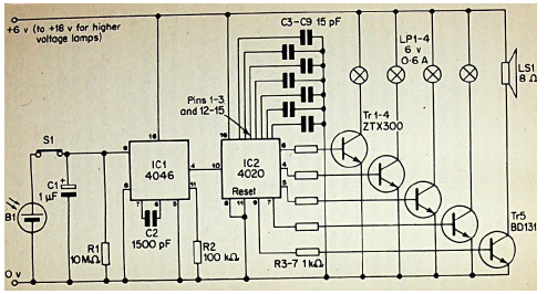 Este circuito acionado por célula solar faz 4 LEDs correrem numa velocidade dada pelo capacitor C2. O circuito é de uma antiga publicação inglesa.
