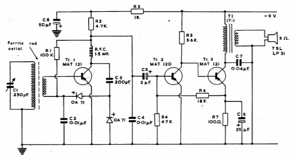 Encontrado numa documentação de 1963, este circuito emprega transistores de germânio da época. O transformador e a bobina também são tipos comuns da época.