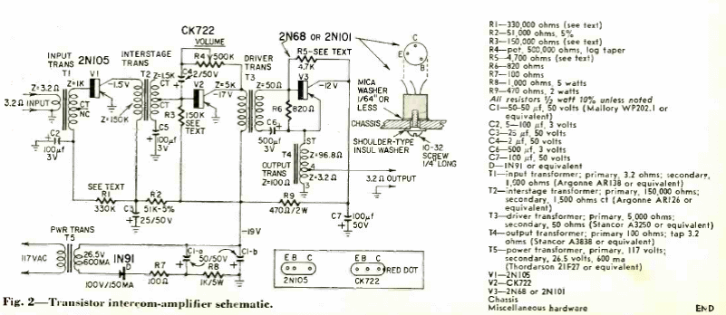 Este circuito usando o CK722 entre outros saiu numa Radio Electronics de setembro de 1950. Era um dos primeiros circuitos deste tipo publicado com transistores que começavam a chegar ao mercado.