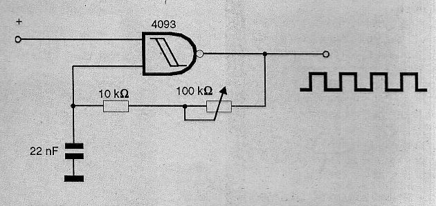 Este oscilador produz um sinal retangular na faixa de 100 Hz a 1 kHz, mas com a troca do capacitor, podemos obter outras faixas de frequências. O ajuste fino da frequência é feito no potenciômetro de 100 k ohms. Neste circuito, apenas uma das quatro portas do 4093 é usada. A alimentação positiva de 3 a 15 V é feita no pino 7 e o terra é no pino 14.