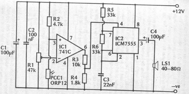 Este circuito tem por finalidade avisar o esquecimento de luzes acesas. Encontramos numa documentação inglesa antiga. O sensor é um LDR comum.