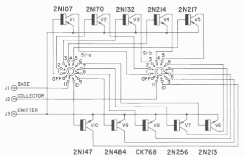 Este circuito, comum nos anos 50, continha transistores básicos que poderiam ser experimentados ao se realizar o desenvolvimento de um projeto. Pode-se fazer o mesmo com transistores modernos.