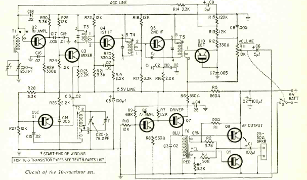 Este rádio de 10 transistores foi encontrado na revista Radio Electronics de dezembro de 1964. Os componentes são tipos da época como os transistores e as bobinas e transformadores, difíceis de obter em nossos dias. O rádio era alimentado por tensão de 9 V.