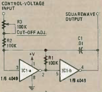 Usando o CMOS 4049 este circuito foi encontrado na revista Radio Electronics de novembro de 1984. O circuito pode ser alimentado por tensões de 3 a 12 V.