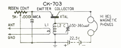 Este circuito é de 1950, do tempo em que alguns ainda chamavam o transistor de tríodo de cristal. O circuito é para a faixa de ondas médias e tem escuta em fones de alta impedância.