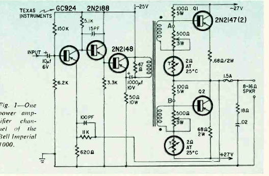 Esta é uma configuração de amplificador dos anos 60 encontrada numa publicação da época. O circuito usa um transformador driver especial que inverte as fases do sinal para excitação dos transistores de saída.