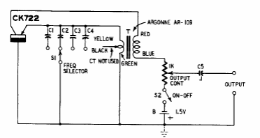 Encontrado em publicação americana sobre transistores dos anos 60, este circuito usa um transformador de rádio transistor e um transistor de germânio da época. Os capacitores determinam a frequência.