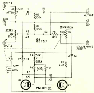 Com este circuito é possível observar dois sinais de baixa frequência ao mesmo tempo na tela de um osciloscópio de um canal. O circuito é de uma revista Radio Electronics de agosto de 1966.
