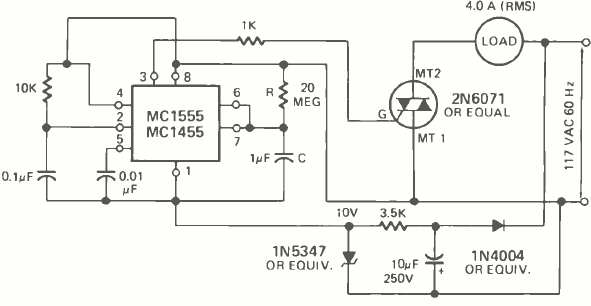 Este circuito para cargas de corrente alternada foi encontrado na revista Radio Electronics de fevereiro de 1976. O triac é comum e os tempos são dados pelo resistor de 20 M e o capacitor de 1 uF.