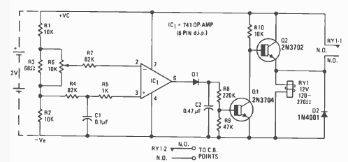 Indicado para aplicações em alarmes, este circuito é uma modificação do anterior. Encontramos na revista Radio Electronics de dezembro de 1976. O circuito é para carros com baterias de 12 V.
