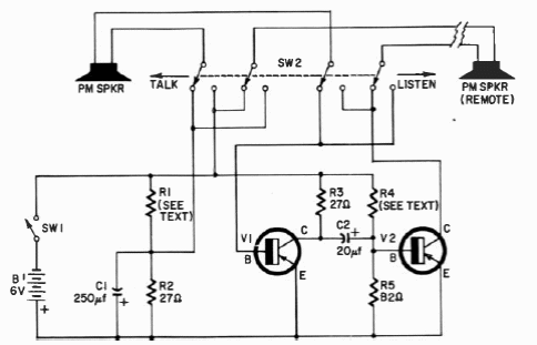 Este intercomunicador para duas estações foi encontrado numa documentação de 1966. R4 deve ser obtido experimentalmente ficando entre e 470 ohms e 4k4 tipicamente. Os transistores são 2N301.