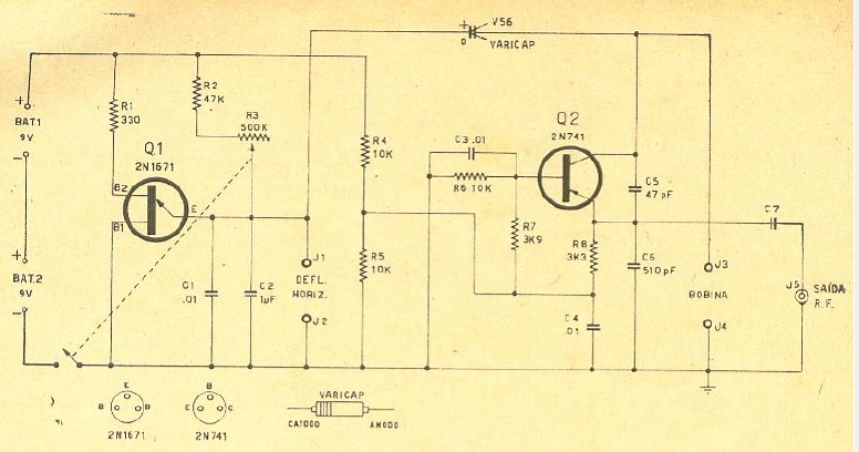 Este circuito é de uma documentação de 1965. No entanto, pode ser elaborado com transistores modernos. A alimentação vem de duas baterias de 9 V.