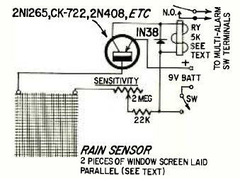 Este simples circuito que aciona um relé foi encontrado na revista Radio Electronics de maio de 1966. O sensor é formado por duas telas tendo entre elas um tecido com uma pequena quantidade de sal.