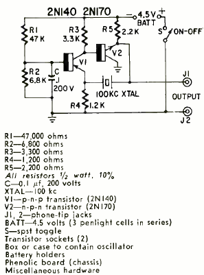 Este bem conhecido oscilador com transistores complementares foi encontrado na revista Radio Electronics de novembro de 1960. O circuito tem a frequência controlada por um cristal de 100 kHz.