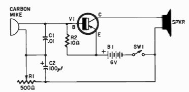 Encontrado numa documentação de 1999 este circuito faz uso de transistor de germânio de potência e de um microfone de carvão. A bateria deve ser de alta potência ou pilhas grandes.