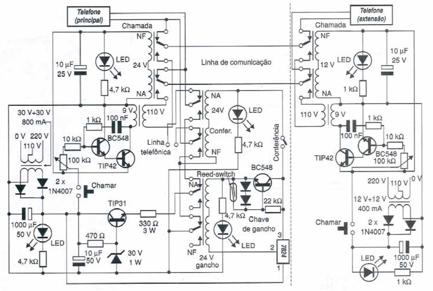 A finalidade deste circuito é estabelecer uma comunicação entre dois pontos utilizando telefones comuns. O circuito é bilateral, admitindo que os dois lados possam receber e fazer chamadas. Sua alimentação é feita a partir de urna fonte com transformador de 30 a- 30 V x 800 mA. A corrente é retificada e filtrada passando por um resistor de 330 ohms x 3 W, que faz a redução da tensão para o funcionamento do circuito.