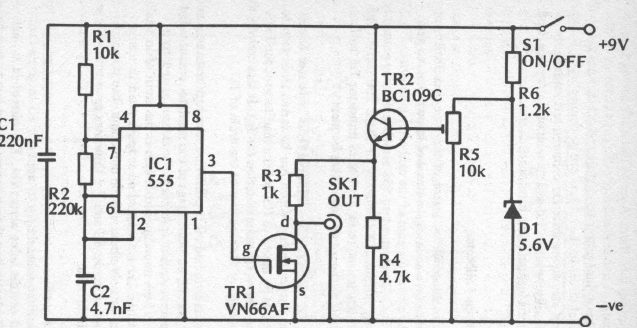 Este circuito se destina ao fornecimento de um sinal padrão para calibração de osciloscópio. Encontramos numa documentação inglesa de 1989. O FET é o componente crítico.