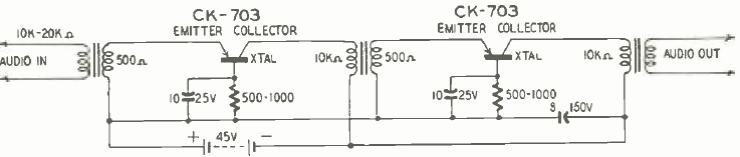 Este circuito de 1950 usava um dos primeiros transistores comerciais e tinha duas etapas para sinais de áudio. O circuito tinha bom ganho para época, já mostrando as possibilidade futuras dos transistores.