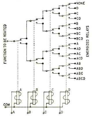 Com o acionamento codificado dos relés pode-se controlar qual das saídas de 16 recebe a alimentação do sinal de entrada. O circuito é de uma Radio Electronics de outubro de 1961.