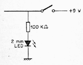 Esta é a configuração mais simples para acender um LED. O circuito é de documentação inglesa antiga que errou no valor do resistor. Para 9V deve ter entre 470 ohms e 1 k.