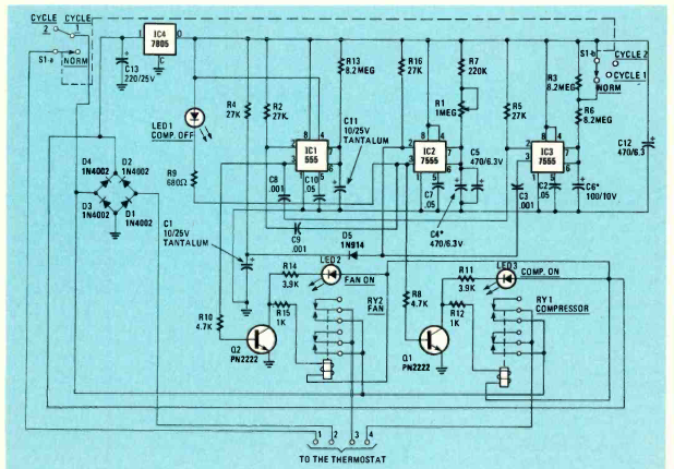 Este circuito, para controlar sistemas de ar-condicionado foi encontrado na revista Radio Elecrtronics de julho de 1984. O circuito é para tipos antigos da época que não tinham controle microcontrolado.