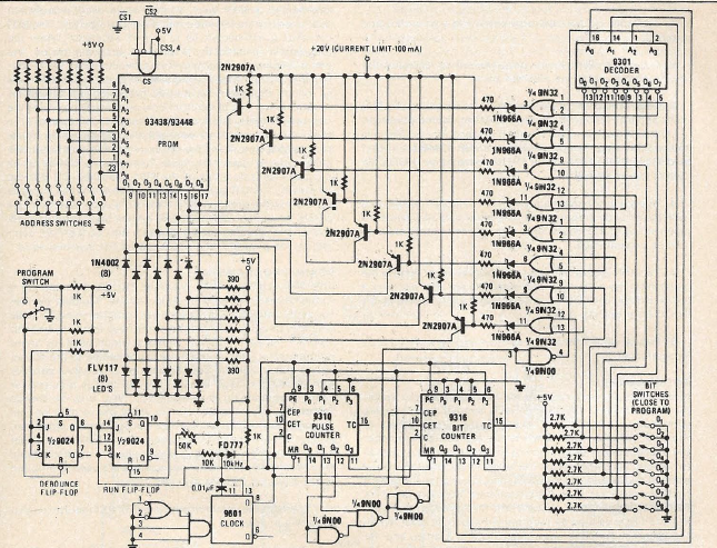 Este é circuito típico de um programador de PROM dos anos 70. Saiu na revista Radio Electronics de 1979. Observe que a programação era feita manualmente byte por byte através de chaves.