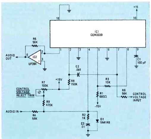 Este circuito para efeitos em sintetizadores de música foi encontrado na revista Radio Electronics de maio de 1983., O circuito exige alimentação de 15 V.