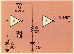 Este oscilador XTAL foi encontrado na revista Radio Electronics de janeiro de 1986. Qualquer porta que possa ser ligada como inversor funciona. A frequência depende do cristal.