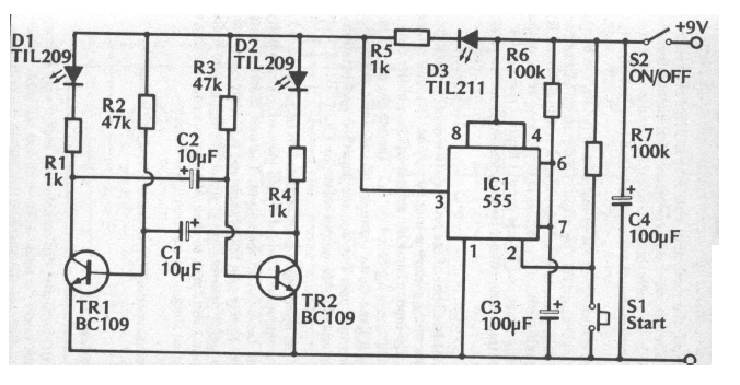 Este circuito de luzes de partida para autorama foi encontrado numa documentação inglesa dos anos 80. Os LEDs devem ser de cores diferentes, para maior realismo.